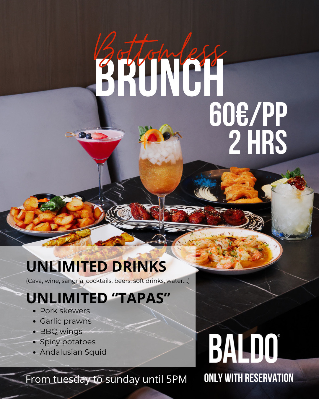 Enjoy two unforgettable hours of unlimited pleasure at BALDO, Benidorm. For just €60 per person, enjoy unlimited drinks (cava, wine, sangria, cocktails, beer, soft drinks, and water) and a delicious selection of Spanish tapas.
